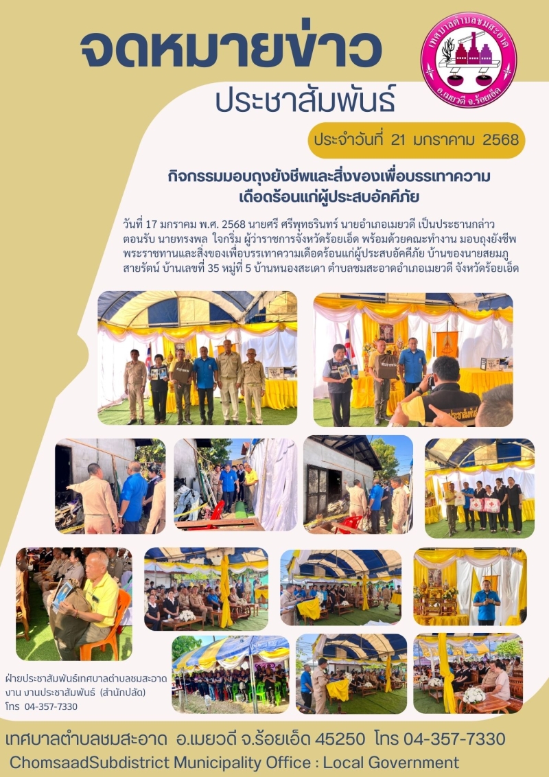 ในวันที่ 17 มกราคม 2568 นายศรี ศรีพุทธรินทร์ นายอำเภอเมยวดี เป็นประธานกล่าวต้อนรับ นายทรงพล ใจกริ่ม ผู้ว่าราชการจังหวัดร้อยเอ็ด พร้อมด้วยคณะทำงาน เพื่อมอบถุงยังชีพพระราชทานและสิ่งของเพื่อบรรเทาความเดือนร้อนแก่ผู้ประสบอัคคีภัย บ้านของนายสยมภู สายรัตน์ บ้านเลขที่ 35 หมู่ที่ 5 บ้านหนองสะเดา ตำบลชมสะอาด อำเภอเมยวดี จังหวัดร้อยเอ็ด