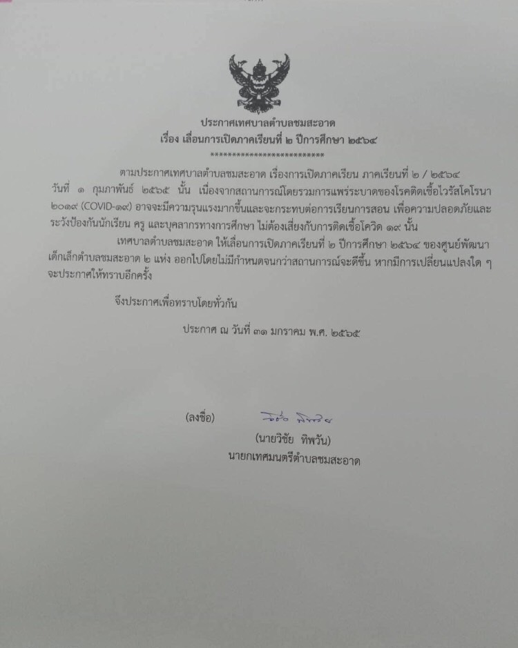 หัวข้อ :: ประกาศเทศบาลตำบลชมสะอาด เลื่อนการเปิดภาคเรียนที่ 2 ปีการศึกษา 2564