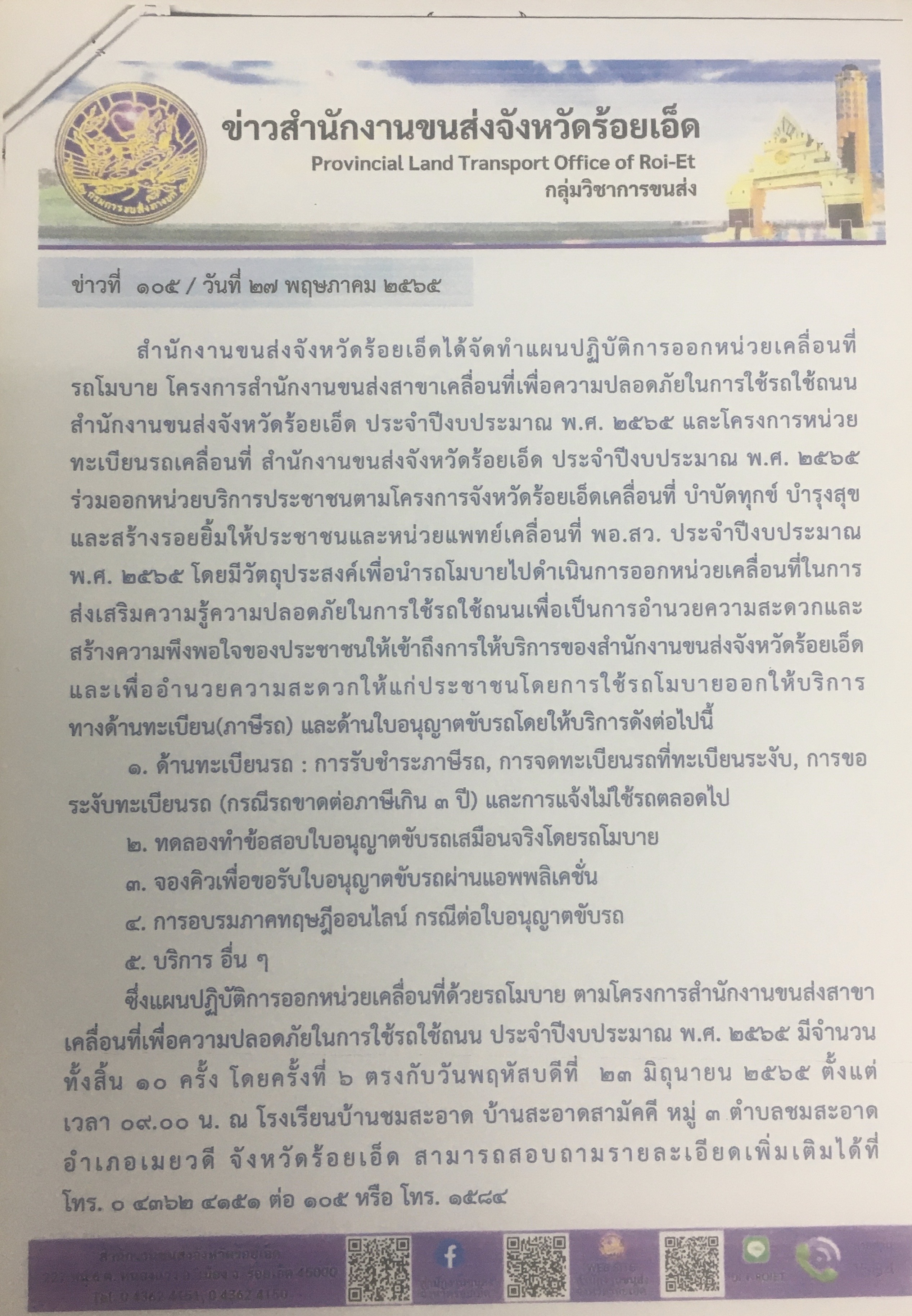 หัวข้อ :: โครงการจังหวัดร้อยเอ็ดเคลื่อนที่ บำบัดทุกข์ บำรุงสุขและสร้างร้อยยิ้มให้ประชาชนและหน่วยแพทย์เคลื่อนที่ พอ.สว. ประจำปีงบประมาณ พ.ศ. 2565