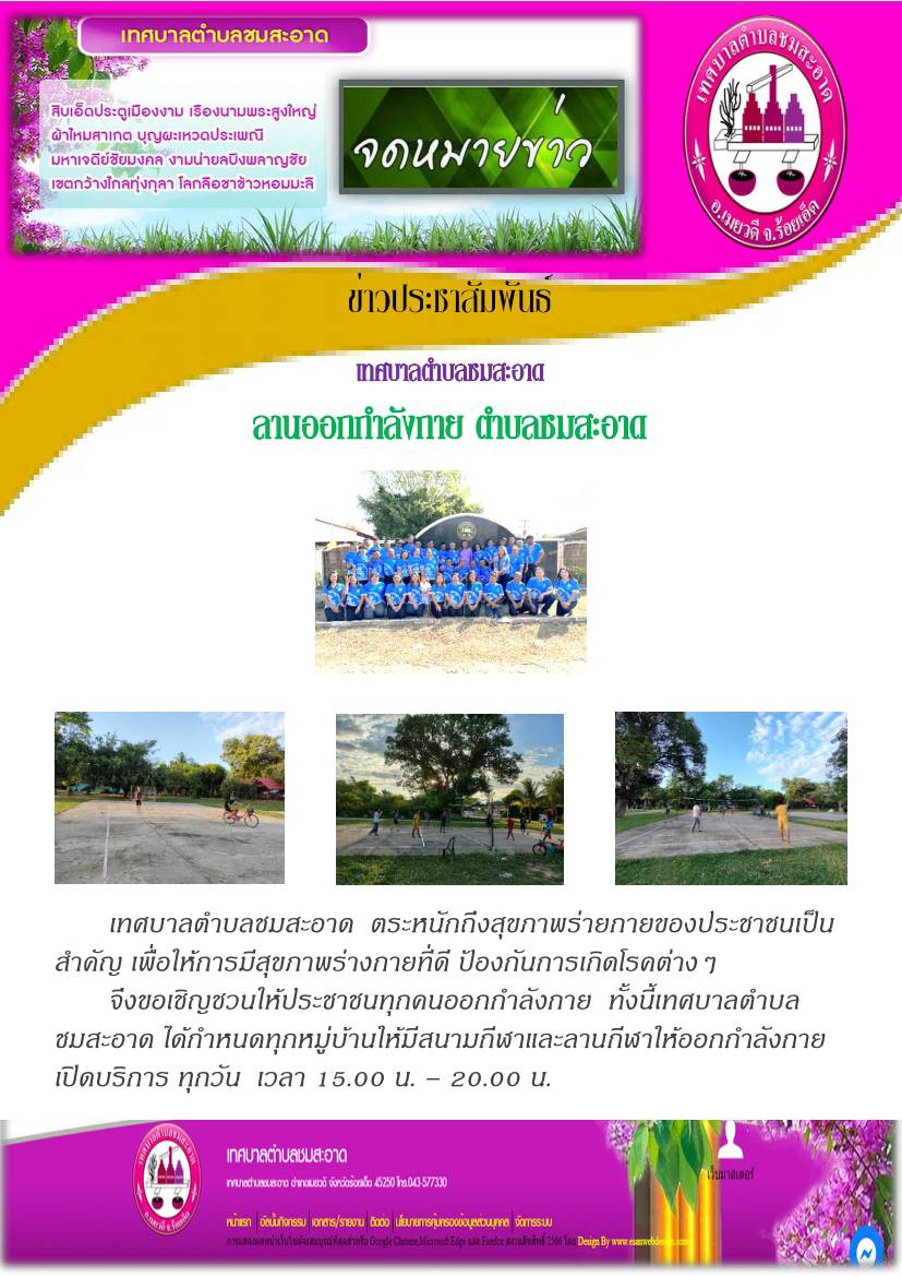 ขอเชิญชวนให้ประชาชนทุกคนออกกำลังกาย ทั้งนี้เทสบาลตำบลชมสะอาด ได้กำหนดทุกหมู่บ้านให้มีสนามกีฬาให้ออกกำลังกายทุกวัน