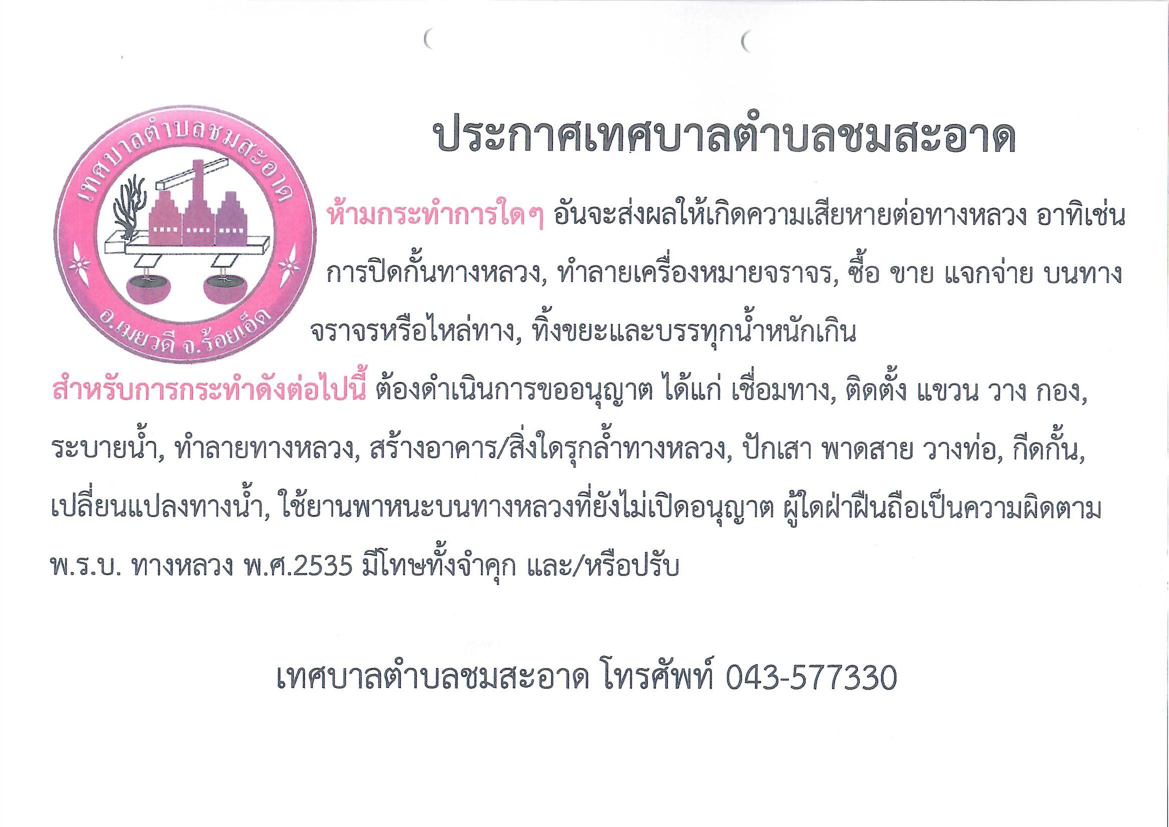 ประกาศเทศบาลตำบลชมสะอาด ห้ามกระทำใดๆ อันจะส่งผลให้เกิดความเสียหายต่อทางหลวง